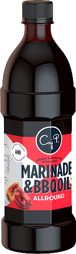 Vatten, rapsolja, salt, kryddor (chilipeppar, svartpeppar, paprika, koriander, kardemumma), kinesisk SOJA (vatten, SOJABÖNOR/SOYABØNNER, salt, socker, VETEMJÖL/HVETEMEL, svamp-/soppekstrakt), rödvinsvinäger/eddik, lök, förtjockningsmedel (E415), konserveringsmedel (E211), vitlök, kryddextrakt.